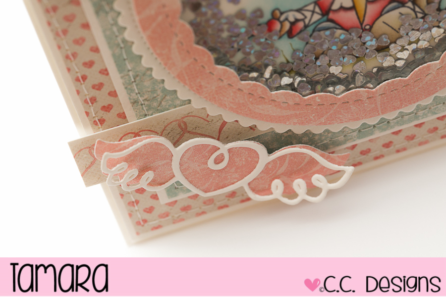 Today I’m sharing with you a shaker card I made for C.C. Designs design team. The image used is called Winged heart. I coloured this cutie using Distress ink pads.
