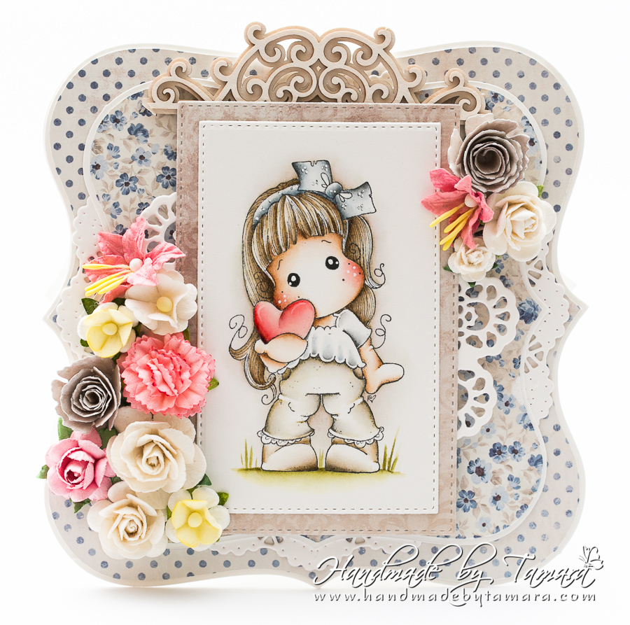 Today I’m sharing with you a Magnolia card. For this card I coloured up Christmas heart Tilda. I used Distress ink pads, Langton 300g HP watercolour paper and Archival ink pad – Jet black.