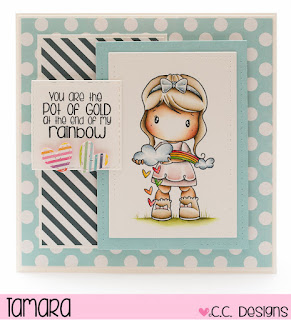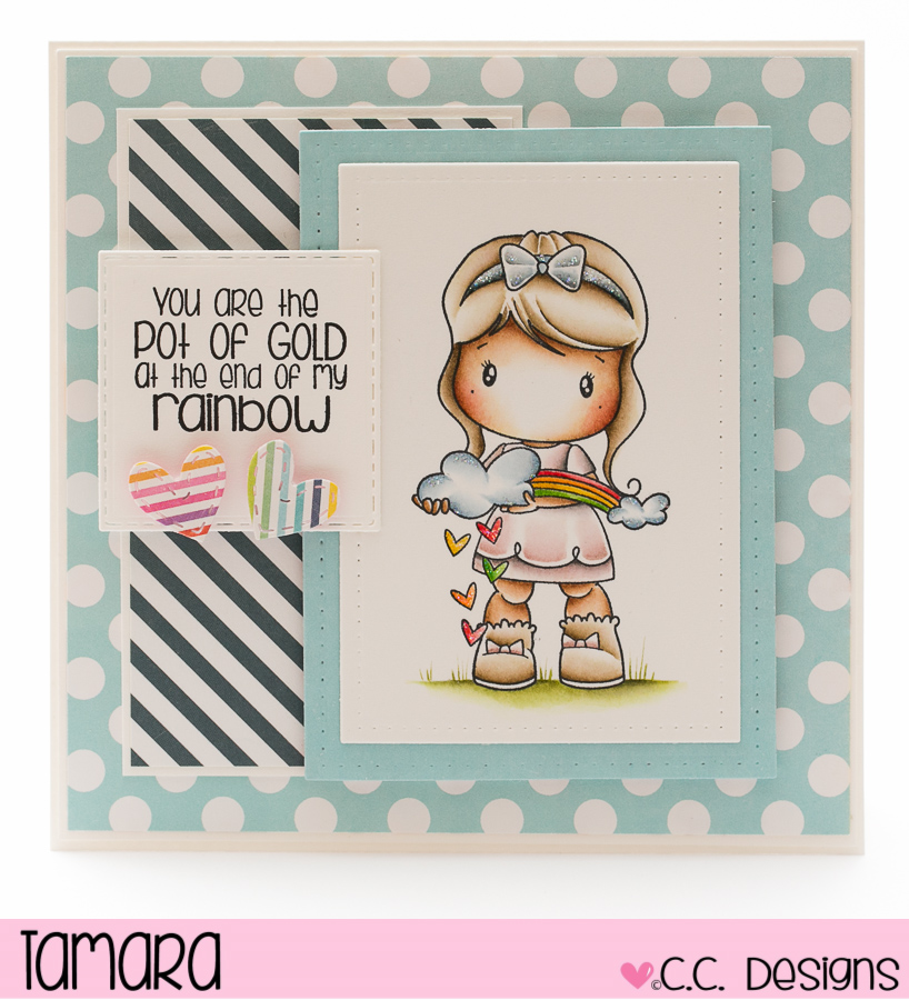 Today I’m sharing a card I made for C.C. Designs Newsletter. I used Rainbow Lucy and coloured her with Distress ink pads.