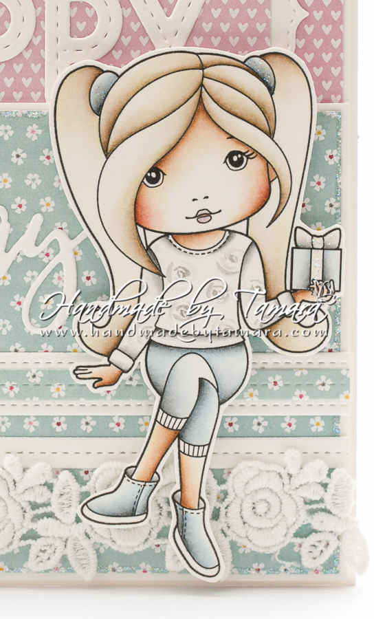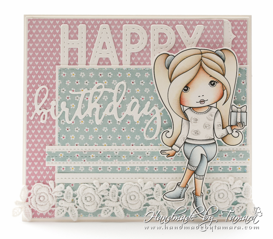 For this card I coloured Birthday Gift Molli. I coloured her using Dsitress ink pads.
