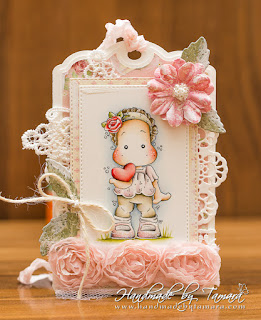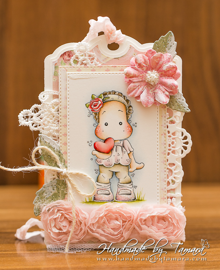 Image was coloured using Distress markers and ink pads. Shape of the tag is a silhouette file. Flower is from Prima, lace from my stock, paper is from Pion, die cuts from Prima …
