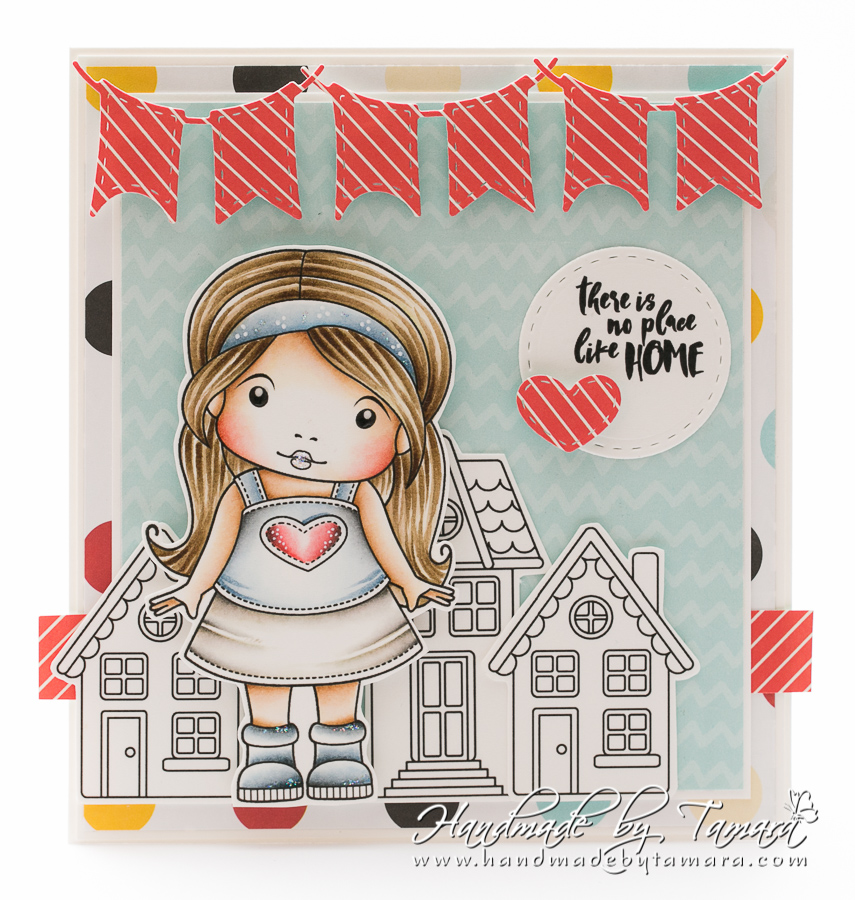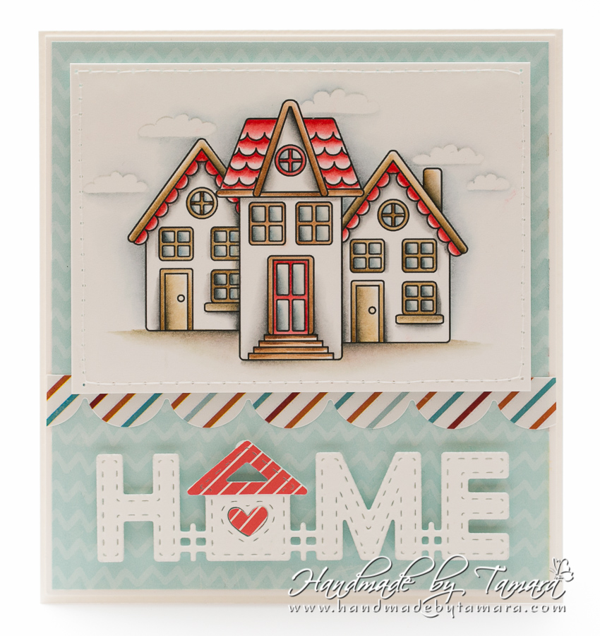 My second club kit project is a Home Welcoming or New Home card. I used No Place Like Home set. I masked houses together and then coloured them with Distress ink pads.