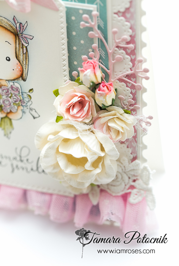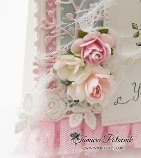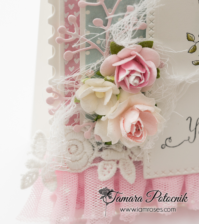 Flowers used are all from I am roses. I added a bit of cheesecloth under them. Ruffled lace and rose lace are from my stash.
