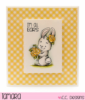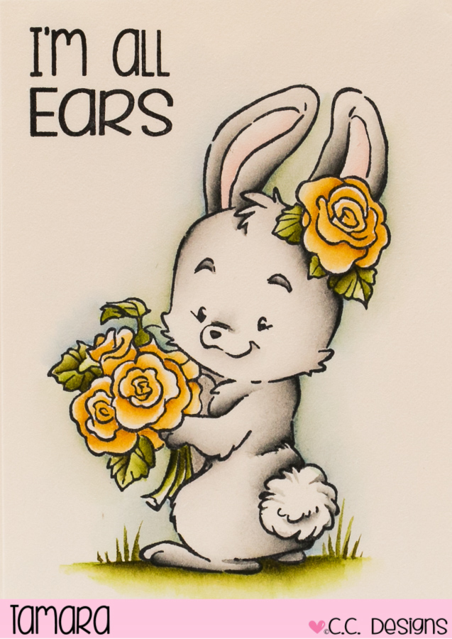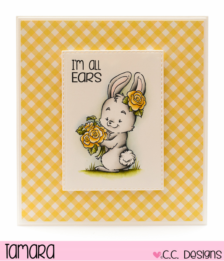Good Morning! Today I’m sharing with you a card made for C.C. Designs Newsletter. I made a CAS card with Rose Bunny. This image is new, it comes as a rubber stamp.