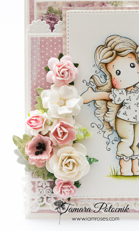 Papers used are from Pion Design (Easter Greetings collection). I used quite a lot of pretty I am roses flowers. I also added some lace and twine from my stash.
