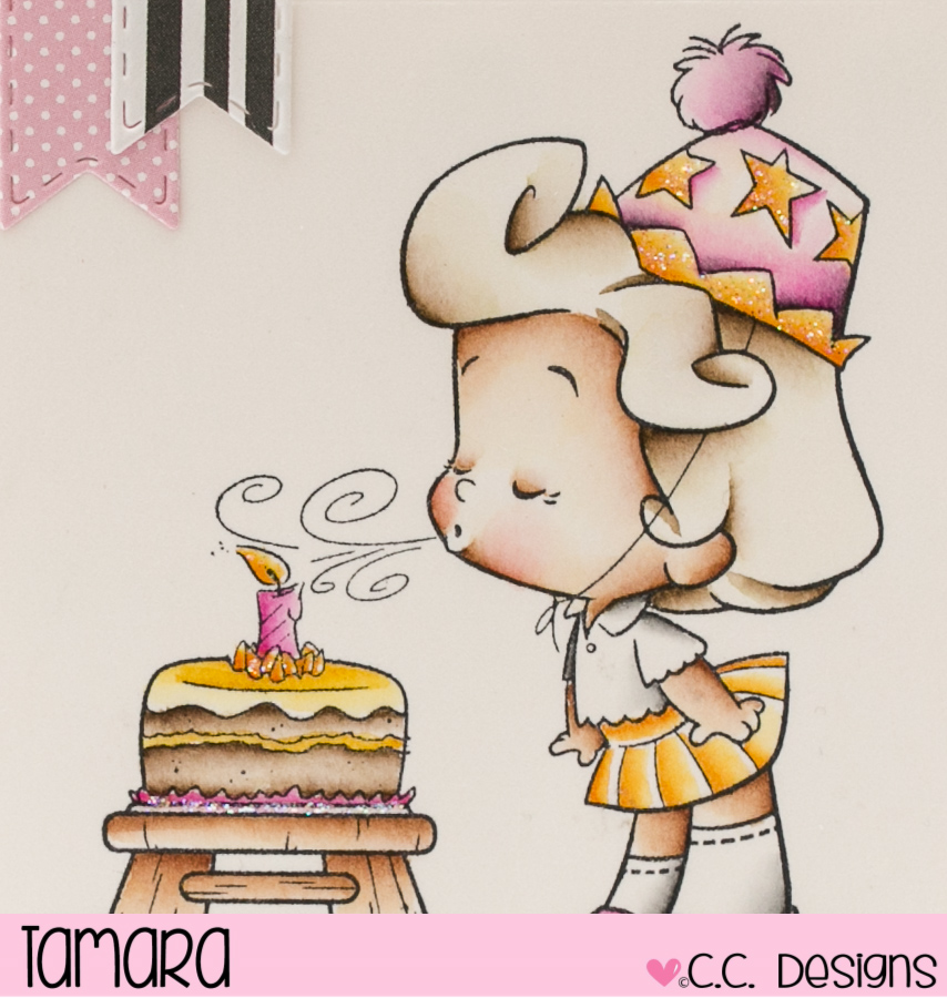 Today I’m sharing a card made for C.C. Design’s Newsletter. I coloured one of Roberto’s Rascals images called Candle Blowing. Image was coloured using Distress ink pads.