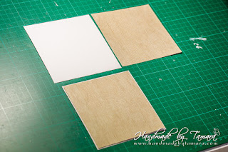 Adhere the (4 3/8″ x 4 3/8″) squares to the bigger ones. Do the same with the smaller one. You get 3 big ones and 1 small one.