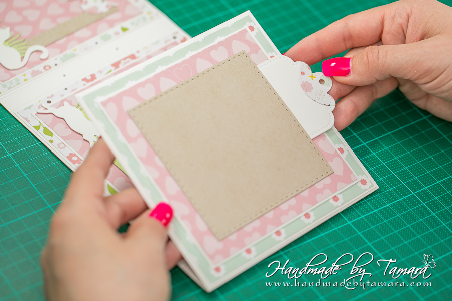 Brads must go through the base. When you have both attached you adhere the last small piece of the design paper and you’re done!