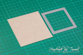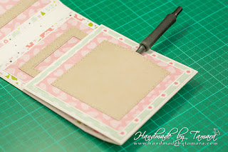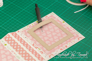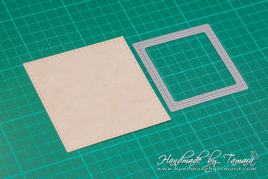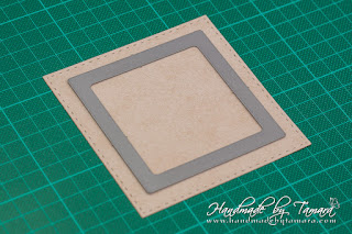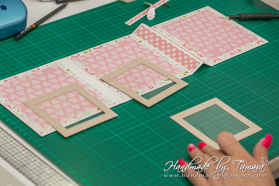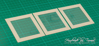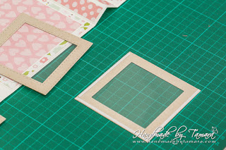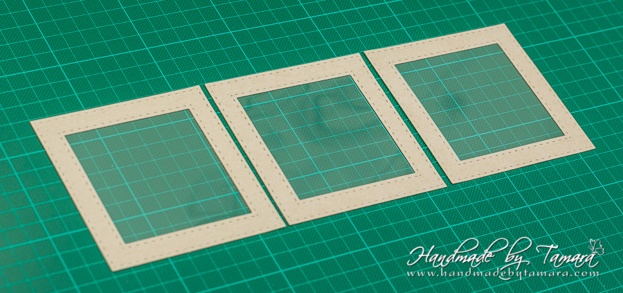 Cut 4 stitched rectangles (the biggest one) from kraft cardstock. Then take the middle size stitched rectangle and cut out the middle of the bigger one so you get a frame for picture. Do the same with 3 of them, leave one whole!