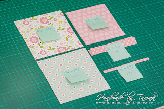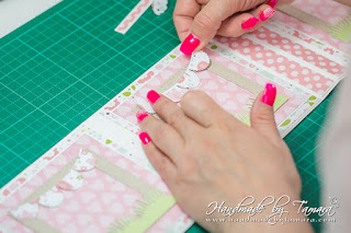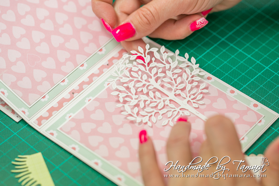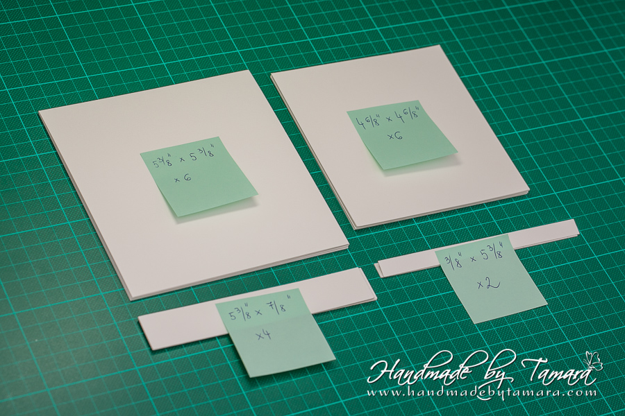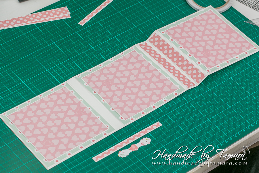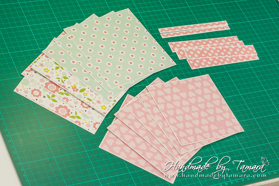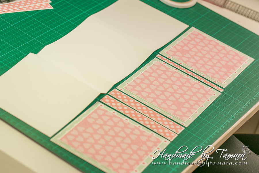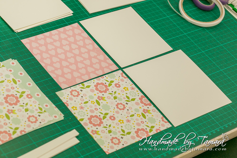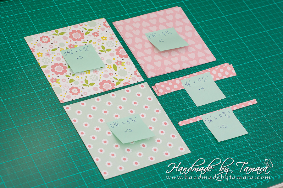 I really love everything to be layered with white cardstock, so now you have to put all white cardstock pieces together with the 1/8″ smaller design paper pieces. There’s a lot of gluing involved but it will make the whole project really sturdy (and extra pretty).