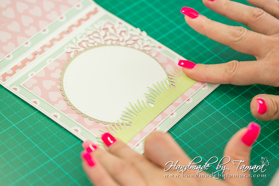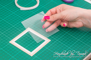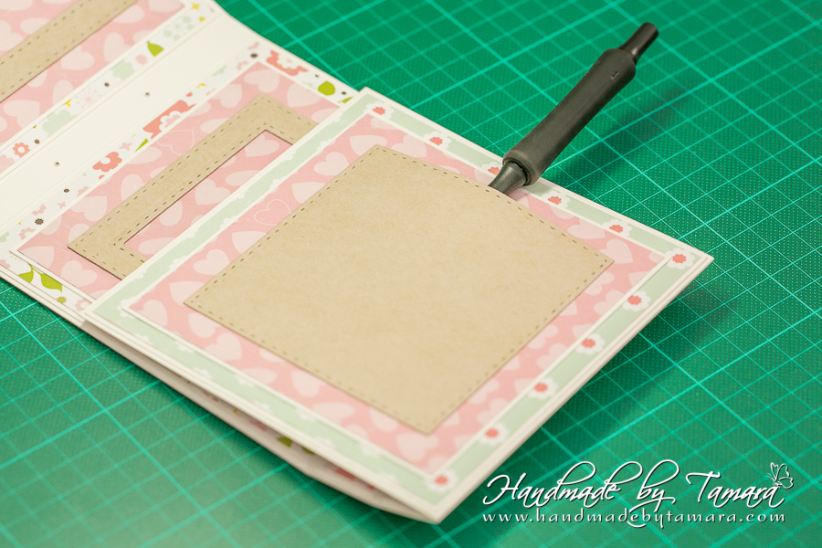 When all layers are adhered (except the inner small piece) you can start decorating the inside. First adhere the frames. Be careful!!! Leave the upper line open so that you can put a picture inside.