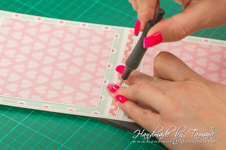 When all layers are adhered (except the inner small piece) you can start decorating the inside. First adhere the frames. Be careful!!! Leave the upper line open so that you can put a picture inside.