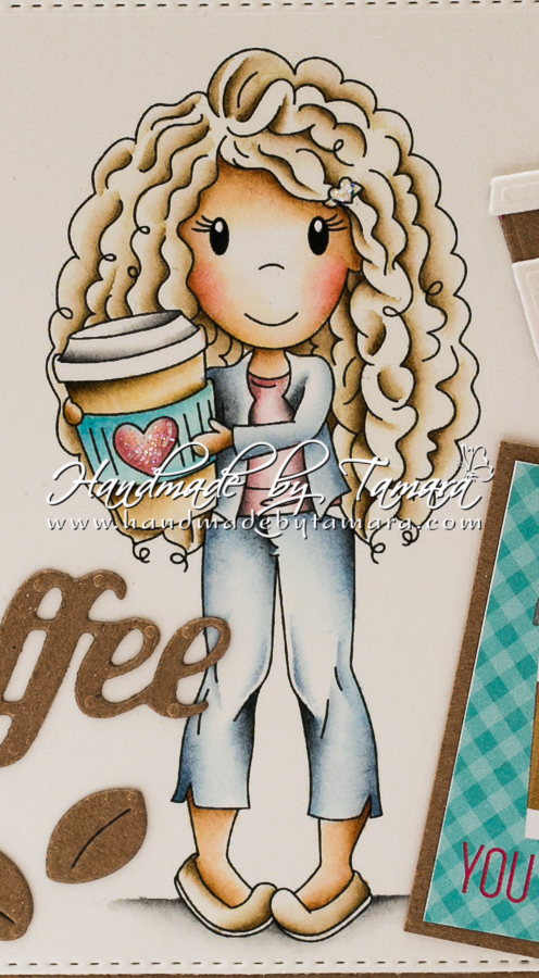 Today I’m sharing with you a coffee themed card featuring a brand new image from Paper Nest Dolls called Avery with Coffee.