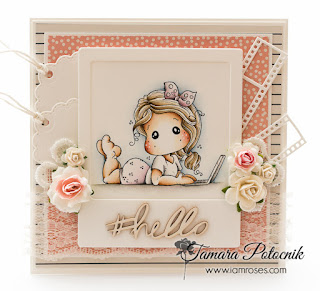To embellish the card I added a few flowers from I am roses, white lace and a #hello chipboard from Scrapiniec.