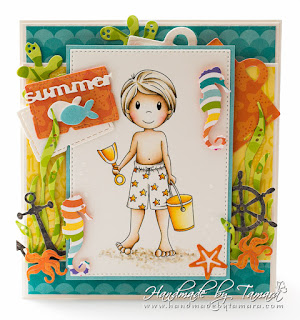 Today I’m sharing with you a card I made with Paper Nest Dolls stamp called Summer Fun Owen. I love this image, he’s so cute and so much fun to colour in. Even though I used only orange on this shorts, the card itself is very happy (because of the super cute Echo Park and Doodlebug papers).