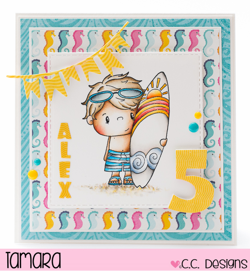 Today I’m sharing with you a card I made for my daughter’s friend’s 5th Birthday. I used one of the digital images available at the C.C. Designs store called Dude (Pollycraft). Image was coloured using Distress ink pads.