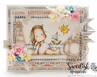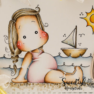 Hi! Today I’m sharing with you a Magnolia Summer card. I masked together two Magnolia stamps (Lounging Tilda and Lounging background). I drew a bit of the waves myself, just to complete the whole scene.