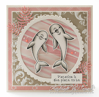 This week’s challenge over at la-la land crafts Inspiration blog is Photo/Colour inspiration. You can see the picture here. For my dt card I coloured cute dolphins from Oceans of Joy set. I only used two Distress colours to colour them: hickory smoke and black soot.