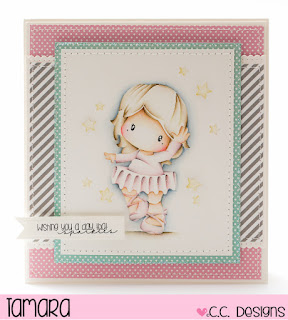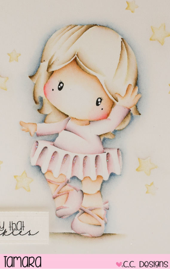 Today I’m sharing with you a sweet girly card made with Swiss Pixie Ballerina from C.C. Designs. I used no lines technique to colour her up. I stamped little stars arround her with one of the little stars from Meoples Unicorn Dreams stamp set.