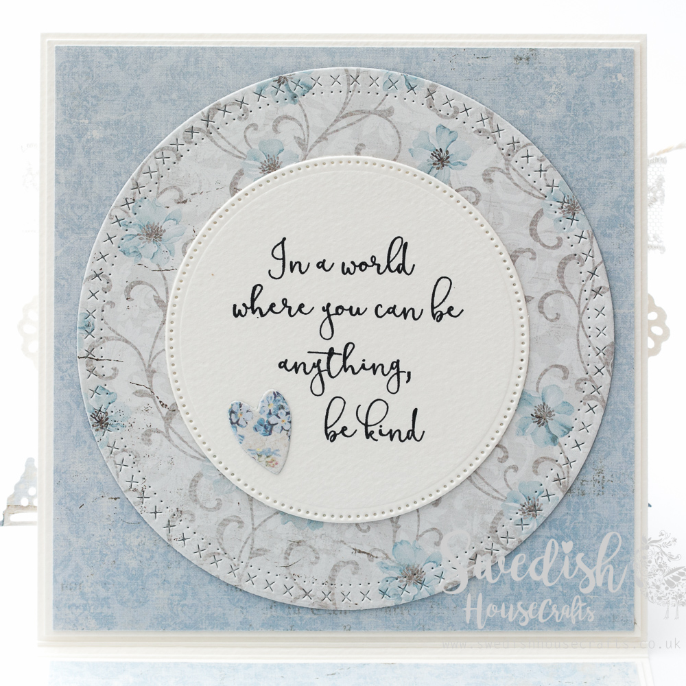 I used lots of pretty dies from the shop. Image was cut out using Stitched rectangles from Gummiapan. I added another layer cut with the same dies on the back of the image just to add a bit more dimension. I cut the largest circle from the Cross stitched circles set and placed it behind the rectangles.