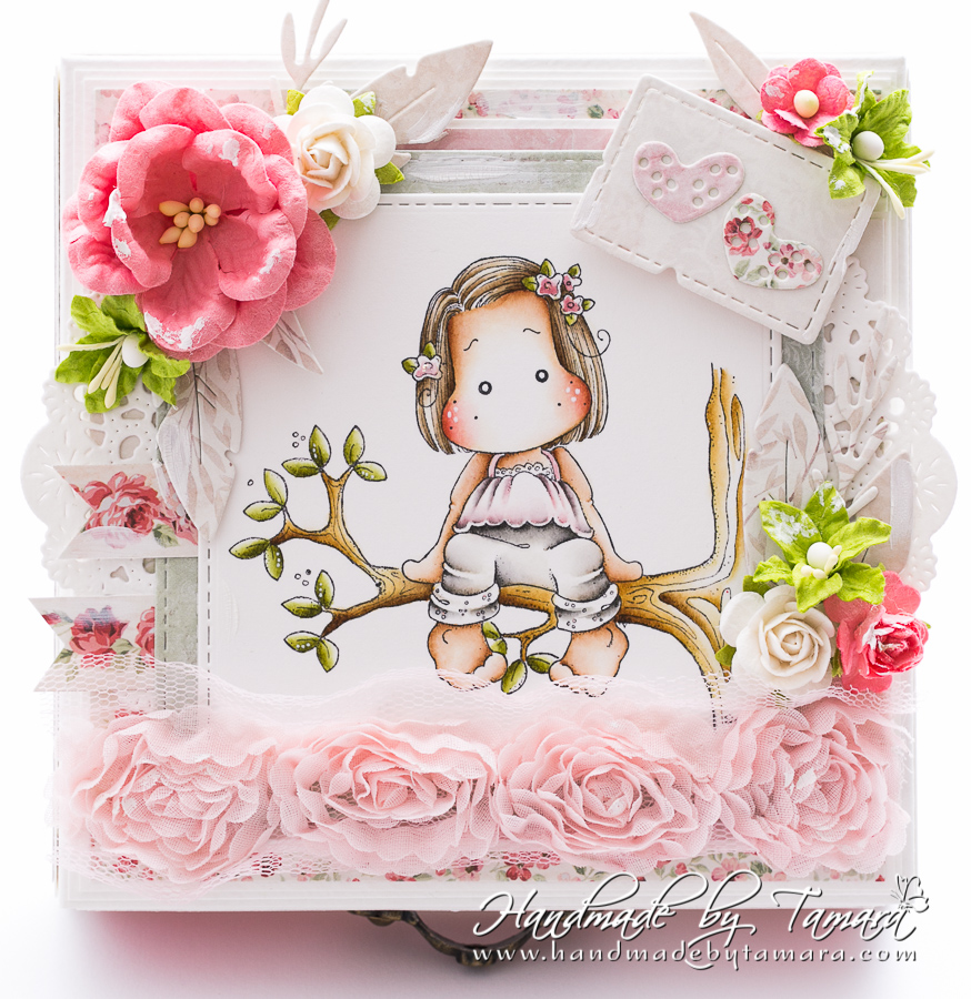 Papers used are from Maja Design – Summertime and Sofiero. I used coral red, green and white flowers from I am roses, Thailand. Lace and door handle are from my stash.