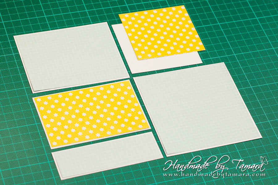 Take your white cardstock again and chosen design papers and cut out 10 rectangles. Five are from white cardstock (measurments bellow) and five from design paper. Rectangles from design papers are all 1/8″ smaller than the ones from white cardstock.