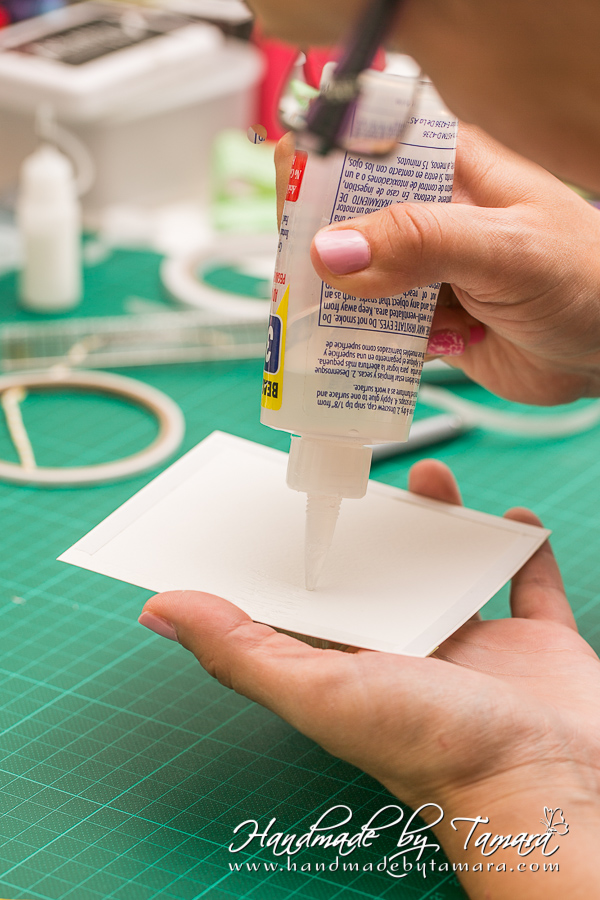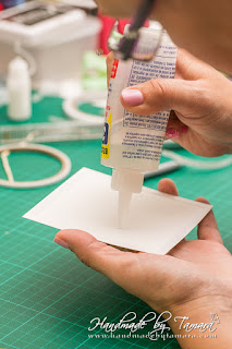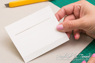 Be careful! When you plan to adhere the 3 3/8″ x 3″ rectangle you only put double sided adhesive on the top and bottom, because you will put a small tag under it from the side. Tag can be pulled out later.