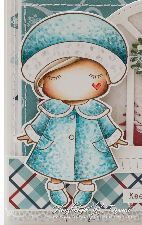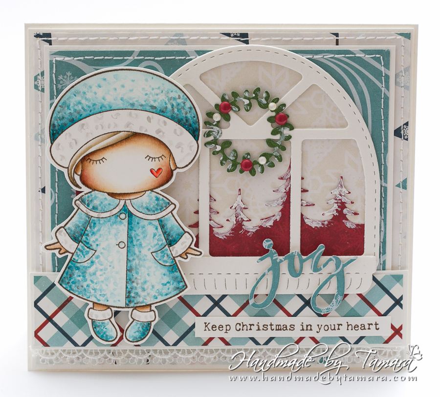 I created a Christmas card with lllc Spring Window. I used Winter Coat Paper Doll Marci and coloured her with Distress ink pads.