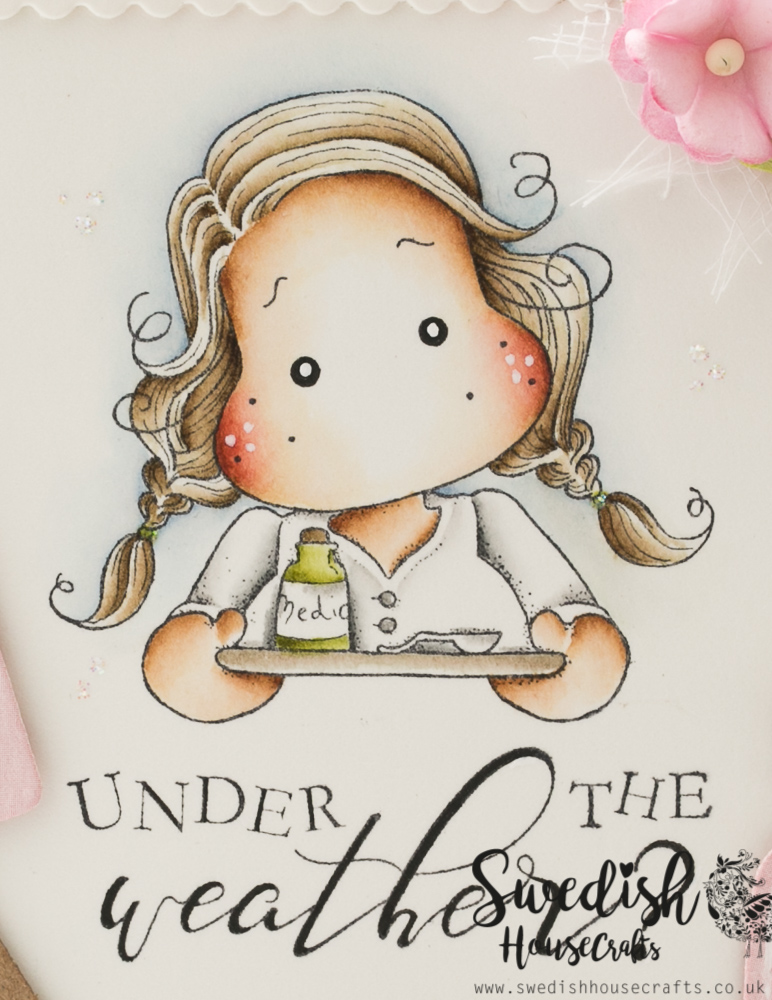 All medicine dies are from Magnolia, also the “Under the Weather?” sentiment. I added two adorable flowers from I am roses and some laces from my stash.