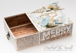 Today I’m sharing with you a gift box made with my favourite stamps and embellishments. For this gift box I used Ice Tilda from Aspen Holidays collection. I coloured the image using Distress ink pads.
