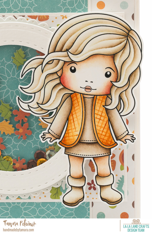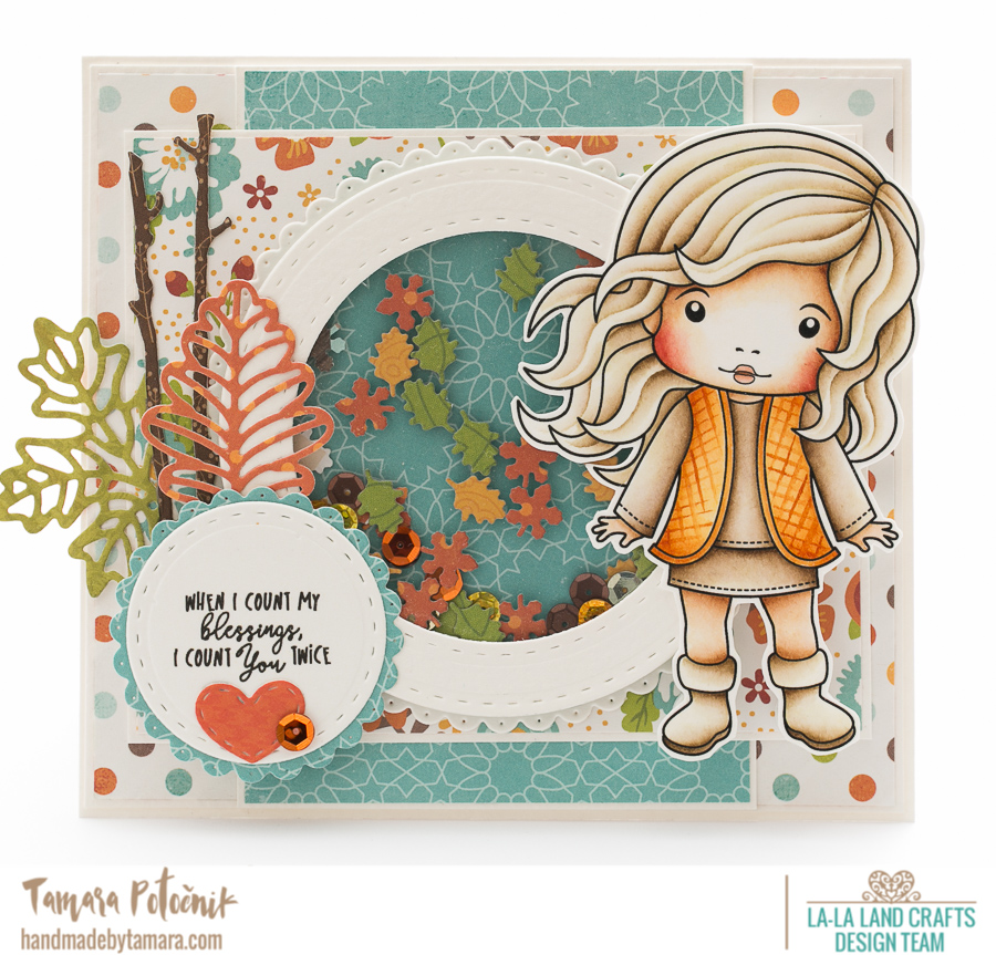 Here are my two projects made with October stamps and dies. My first card is a shaker card with Autumn Marci and all the dies from the kit.