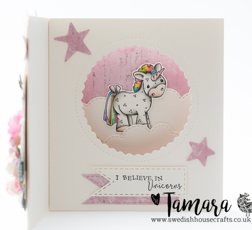 Today I’m sharing with you a card I made for Swedish House Crafts design team. I absolutely love this Magnolia’s image! It’s called Unicorn Tilda and she was released as part of I believe in unicorns collection, 2017. On the inside of the card I used Unicorn with the text from the same release.