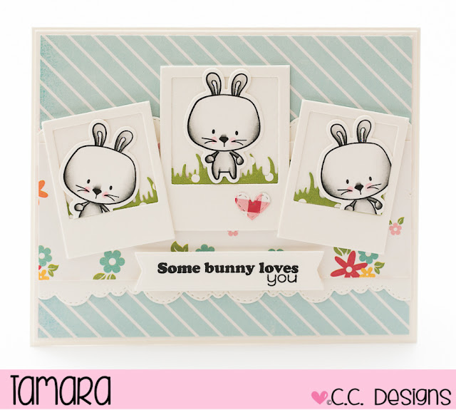 I stamped this cute bunny three times and coloured it with Distress ink pads. I cut out three polariod frames from white cardstock. I cut grass with one of the old CCD dies.