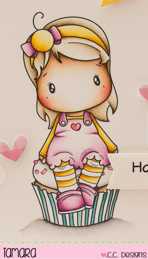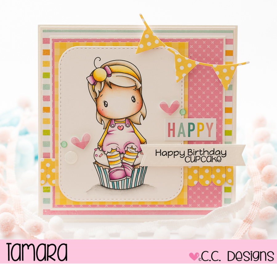 Image was coloured using Distress ink pads. Papers used are from different Echo Park paper collections. Sentiment is from the new Yum Yum Cupcake set and cut out using Banner accessories die.