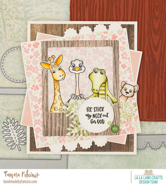 For my blog hop project I made a card using animals from Things are looking up set. First I stamped Wood Planks on kraft paper and cut it out using Photo Elements die. I added a layer of vellum paper on the inside and then filled the frame with peeking animals.