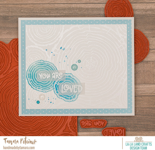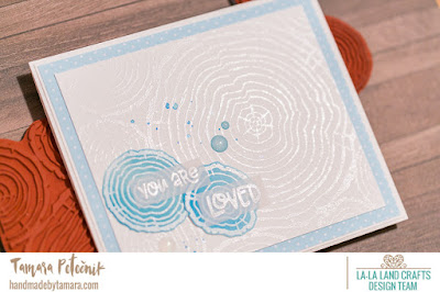 On my first two cards I used WOOD RINGS! I stamped the background stamp on white paper and covered it with white embossing powder and then heat embossed it. Then I stamped both wood rings (accessories stamps) and also embossed them and then coloured them with broken china Distress oxide ink.