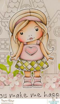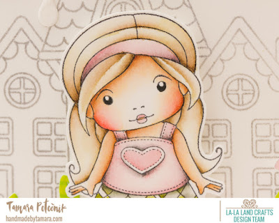 This week’s theme on la-la land challenge blog is SPRING SHOWERS. For my mini notebook I coloured mini Marci from No place like home set. I also used the houses from the same set. I masked them together and used grey ink to stamp them, because I didn’t want them to be too dark.