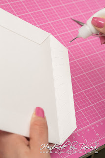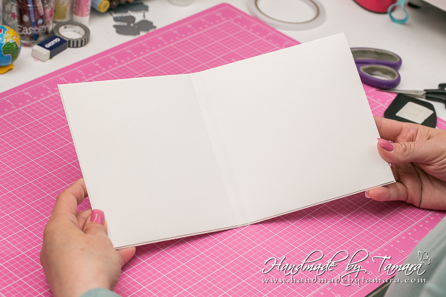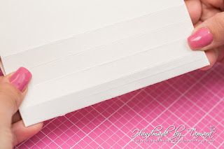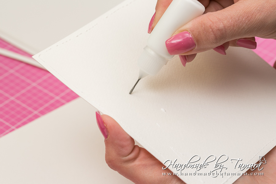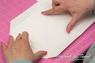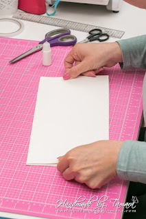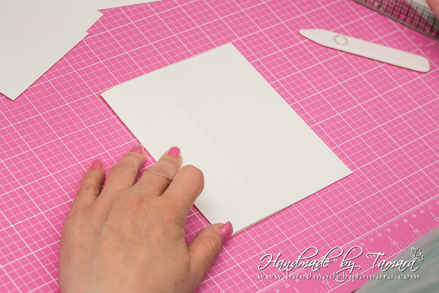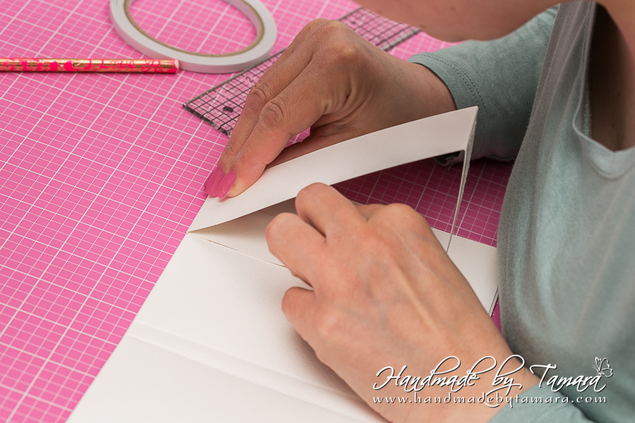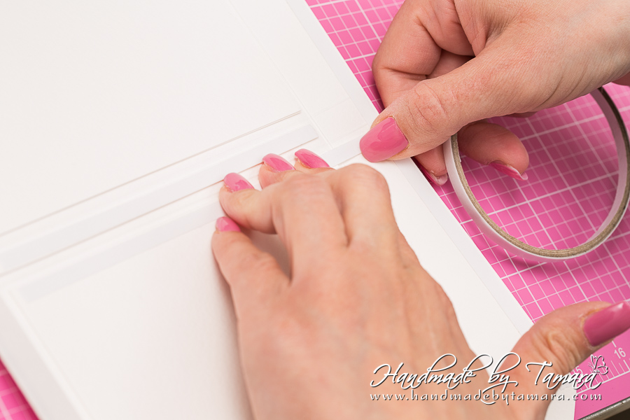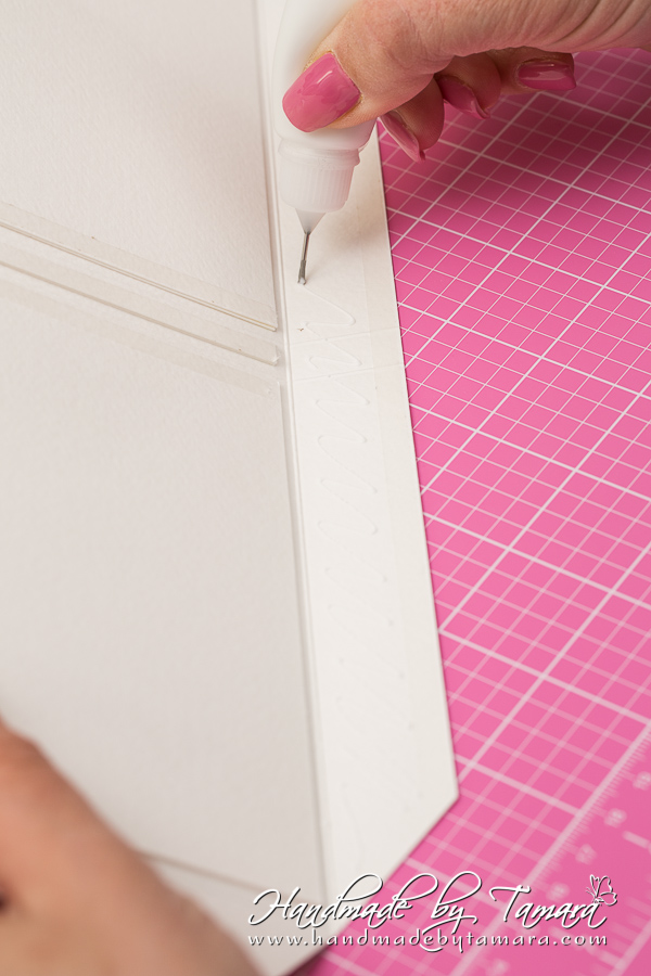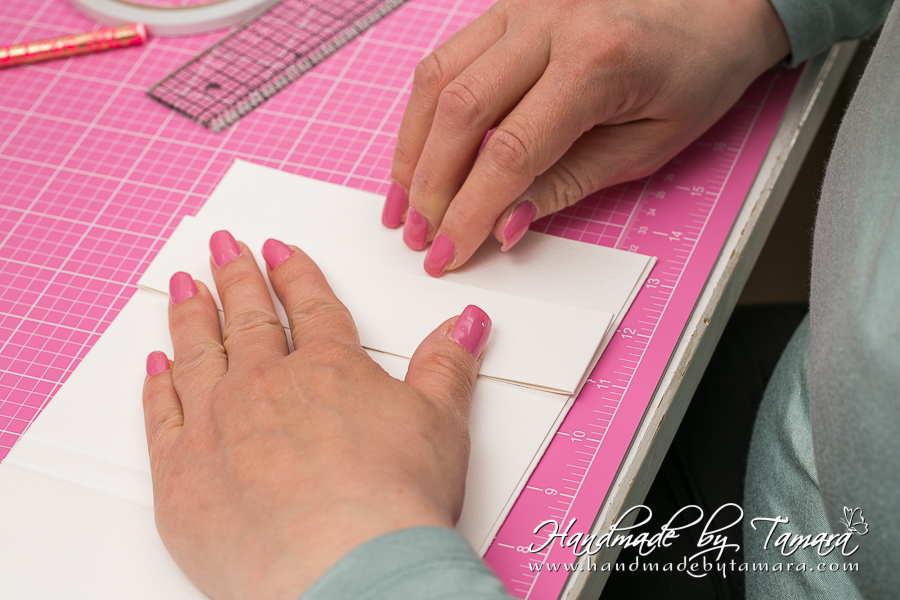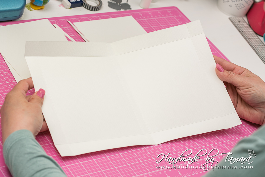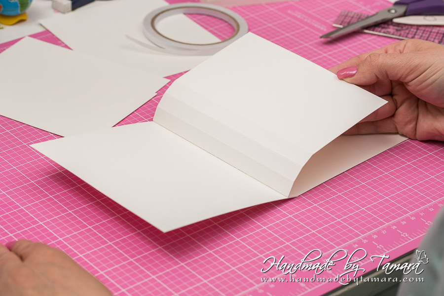 Add double sided adhesive to the first fold as on picture. Then take your white 5.5″ x 6″ piece and adhere it on top of the folded piece.
