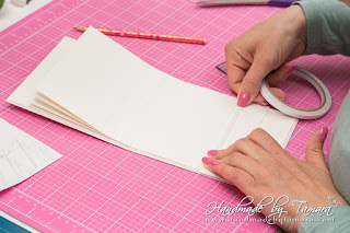 You now have your first fold covered. Do the same with the other one. Fold it first, then add double sided adhesive and adhere the 5″ x 6″ piece. Then turn the page and add 4.5″ x 6″ … until you use all the rectangles you cut before. What you have now is a small notebook where each side is 0.5″ smaller. You can adjust the pages a bit so that they are all lined up at the side.