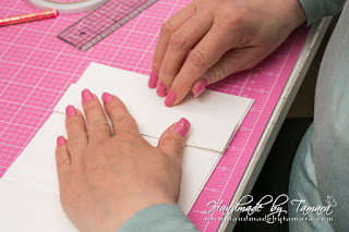 Take the biggest rectangle and make a score line 1″ from all for sides. When you have these, make another 2 score lines both 6 7/8″ from the side (from the right and left). You can see the folds on the picture. Then make folds.