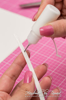 Cut 12 1/4″ x 1 3/8″ long piece of paper and make score lines 3″ from both sides so that the middle part is 6 1/4″ long. Make folds. Add adhesive on the back of flaps.