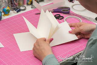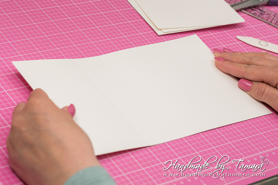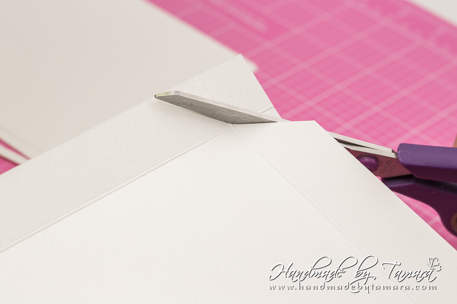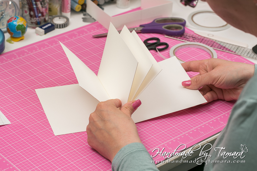 Add double sided adhesive to the first fold as on picture. Then take your white 5.5″ x 6″ piece and adhere it on top of the folded piece.