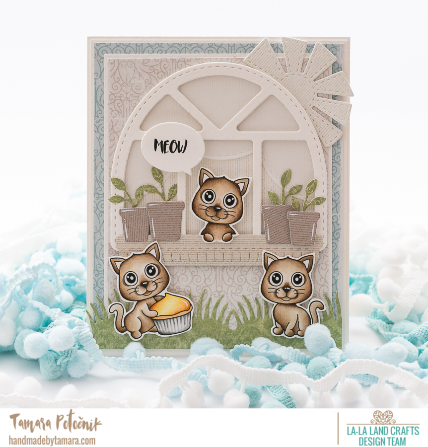 Today I’m sharing with you a card made for la-la land crafts design team cheallenge. For this card I coloured adorable kitties from Tea Time Kittens set.