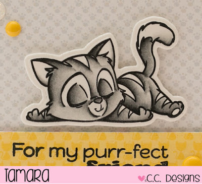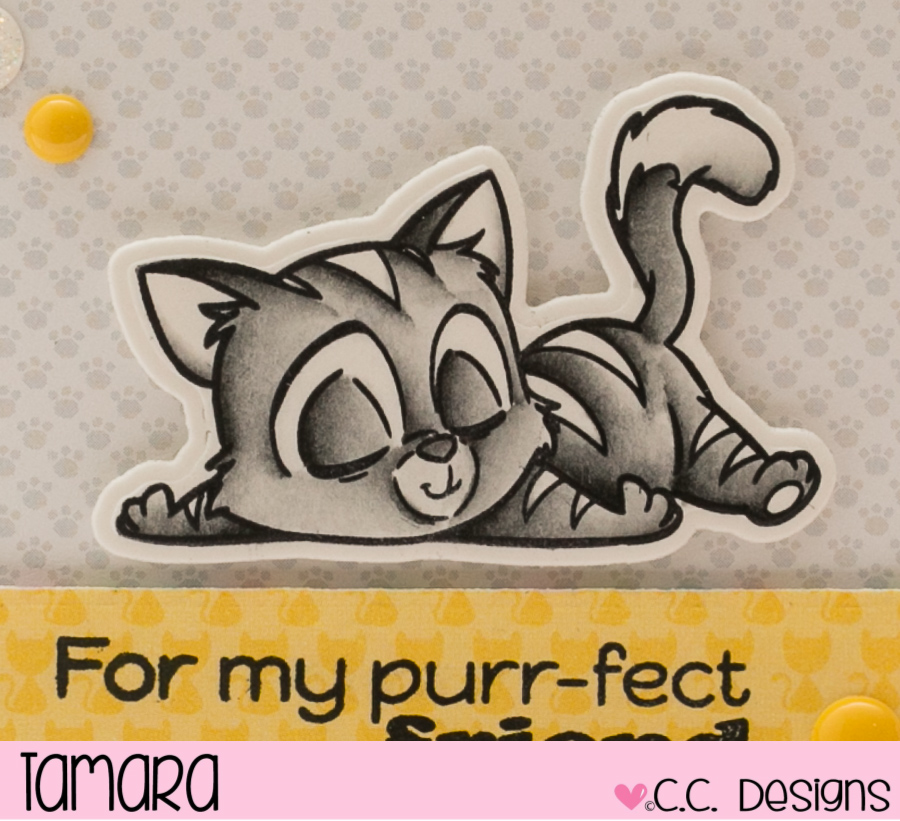 Today I’m sharing with you a card made for C. C. Designs Design Team. I used one of the images from Cutie Cats set. Image was coloured using Distress ink pads and cut out with Cutie Cats outline die.