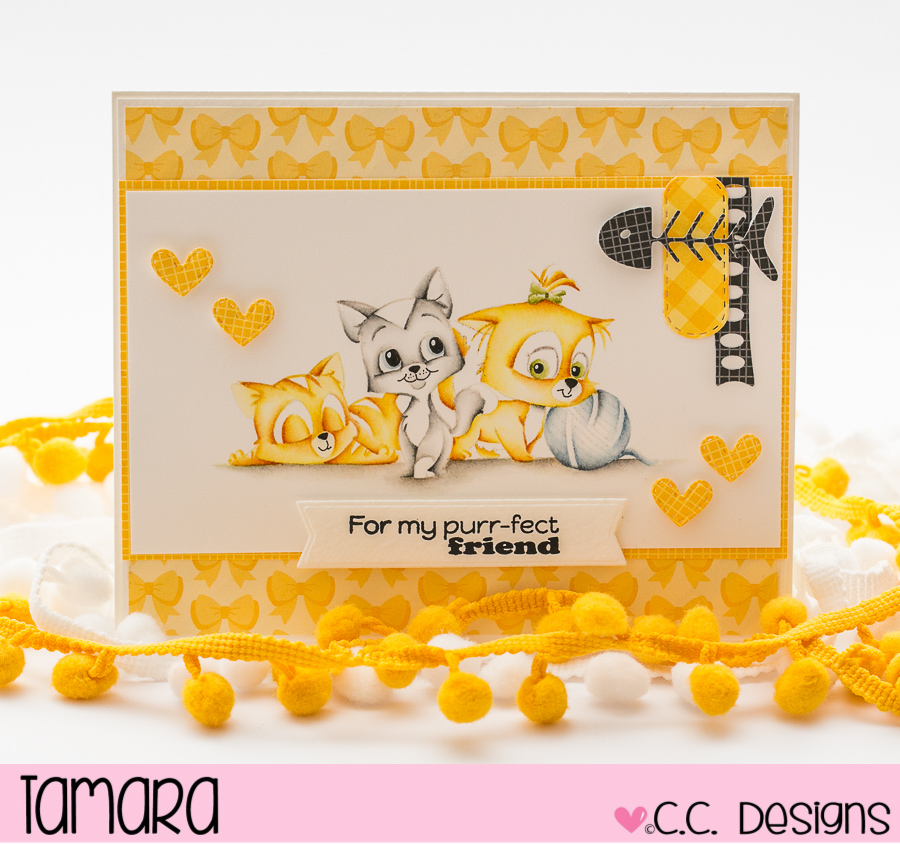 Today I’m sharing with you a card I made for C. C. designs design team. For this project I masked together 4 images from Cutie Cats clear rubber set. I decided to go with the no lines technique and I think they look adorable.