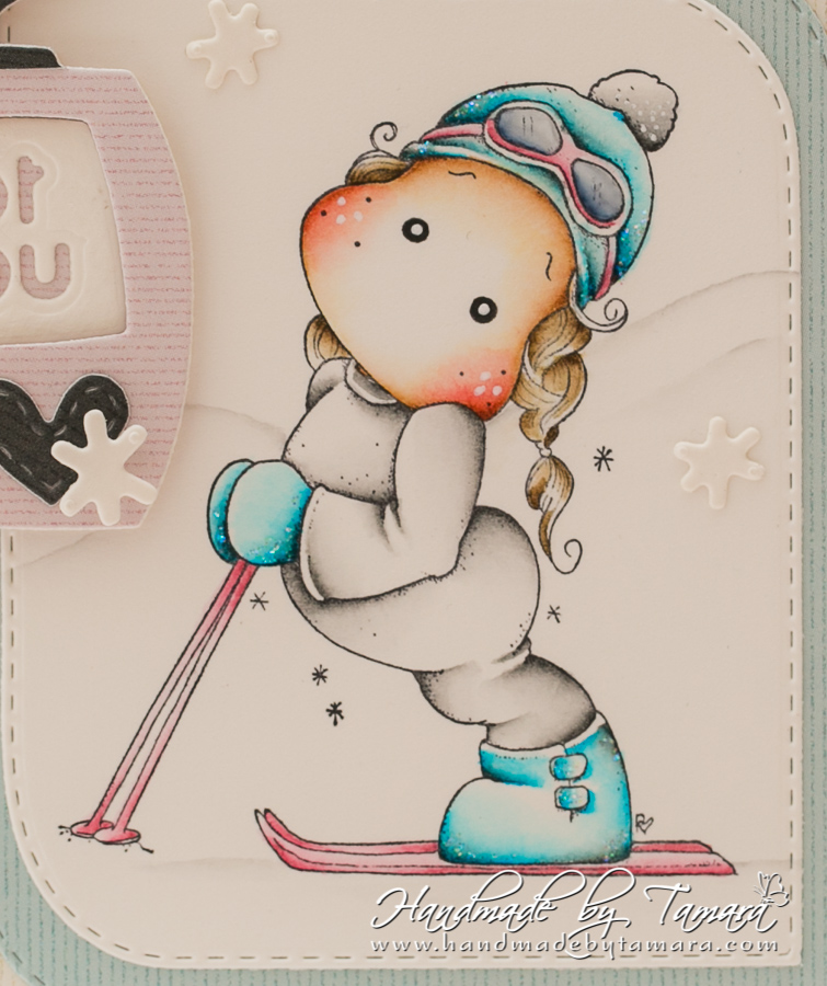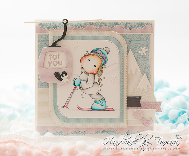 Today I’m sharing with you a winter card. This card was made to hold a voucher for skiing lessons inside. For this special card I coloured Downhill Tilda from Aspen Holidays collection, 2016.