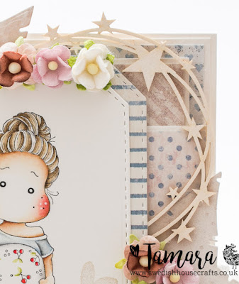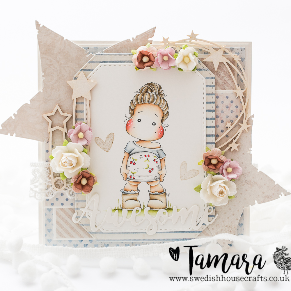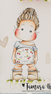 Today I’m sharing with you a sweet Magnolia card. I used Fruit Salad Tilda from Magnolia’s Fruit Salad (2018) collection and coloured her using Distress ink pads. I stamped a few hearts around her (Made with love – Magnolia).