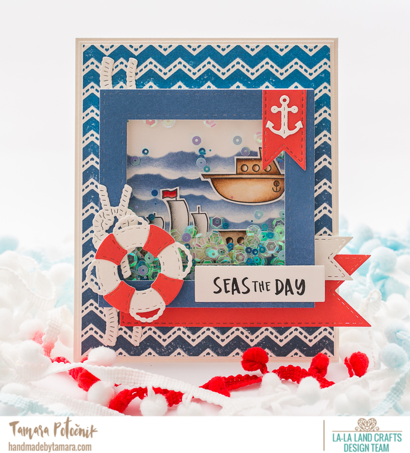 Today I’m back with a card made for La-la land crafts June 2018 Release Showcase. This shaker card was made using stamps from Seas the Day background stamp set.