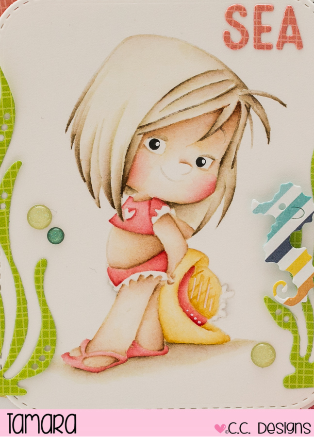 Tamara here with you. Today I’m sharing a card made with one of the girls from Merkini set. This set is part of the amazing new release from C. C. Designs. Image was coloured with Distress ink pads in no-lines technique.