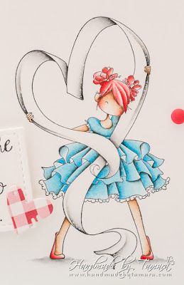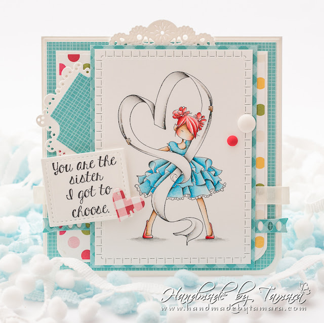 Today I’m sharing with you a card made with one of the sweet Stamping Bella images called Tiny Townie Raven Loves Ribbon.
